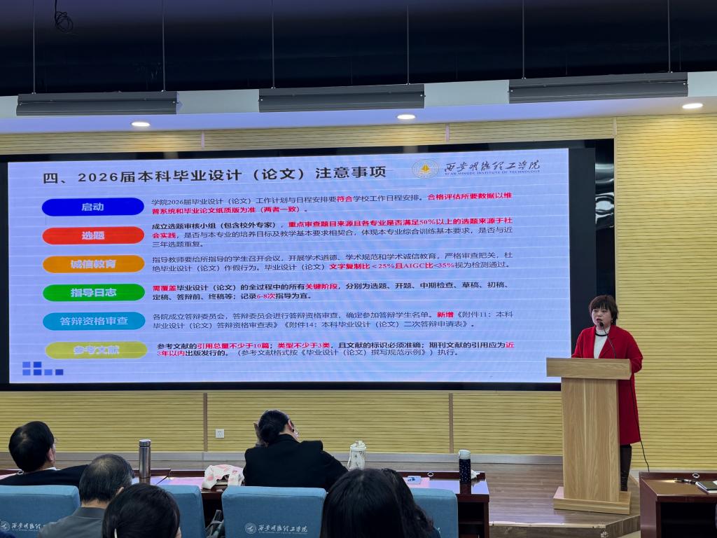 关于2026届毕业论文启动工作,柴芸重点强调:严守质量标准,严格落实学校相关文件要求,教师应严把选题关,指导关,有计划、有组织地落实指导任务、加强监督。同时,她对实验室讲解视频录制、网站数据更新、试卷与论文调阅规范、校企合作实习基地建设等诊断评估重点任务作出工作安排。她强调,学院上下要以高度责任感积极配合,为即将到来的数据核查和诊断评估提供坚实保障。