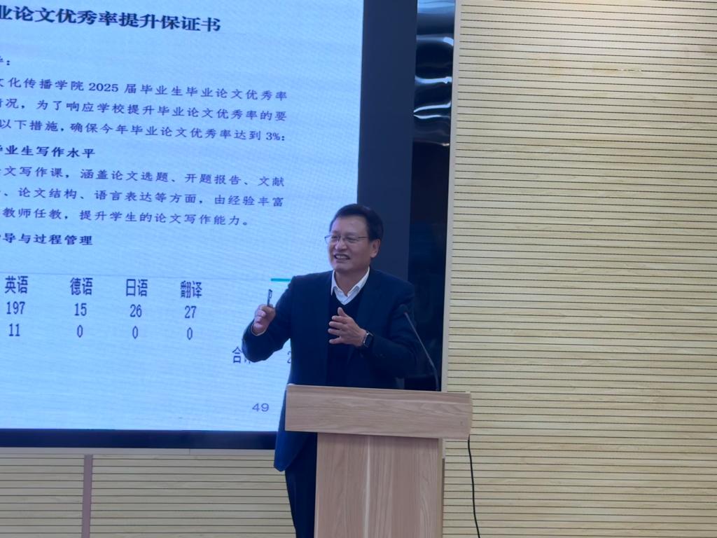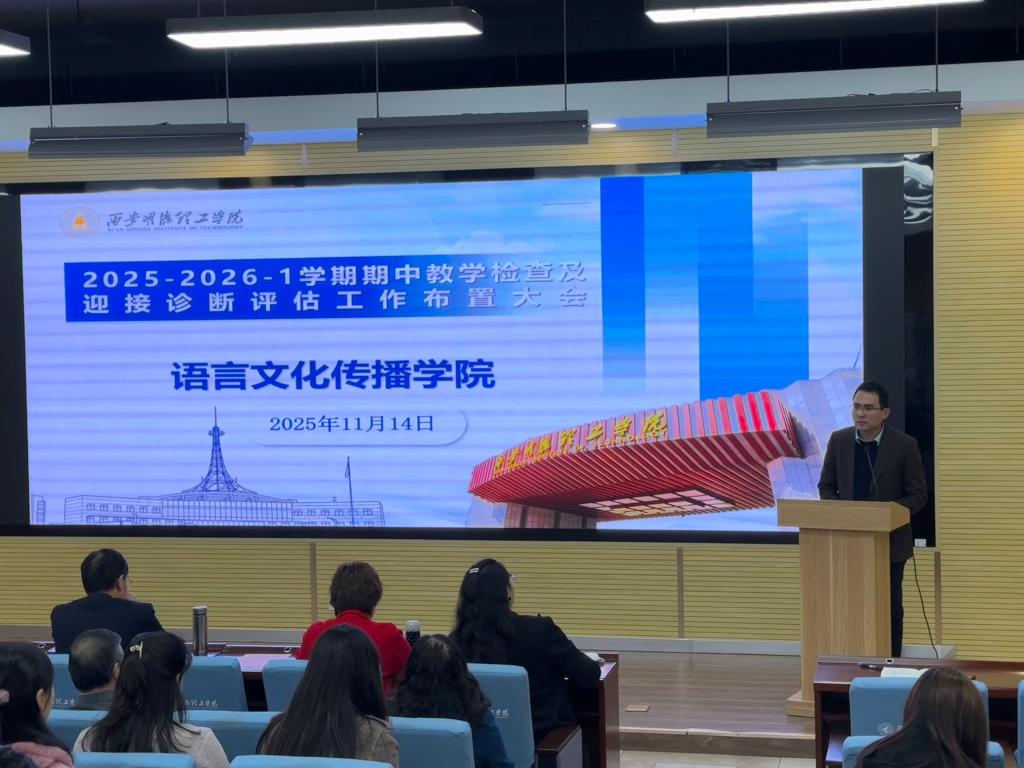 为全面落实学校教学质量建设要求,扎实推进期中教学检查、毕业论文管理及诊断评估各项准备工作,11月14日下午,语言文化传播学院在6号楼201召开2025-2026-1学期期中教学检查及迎接诊断评估工作布置大会。会议由学院党委书记赵旭东主持,学院全体教职工参会。