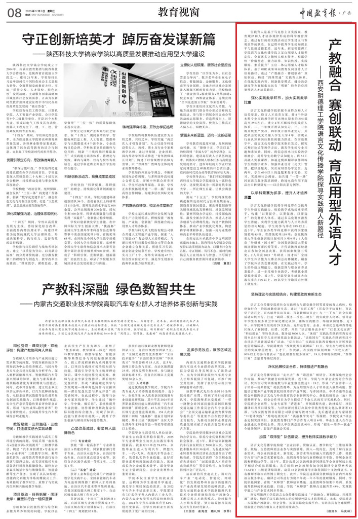 聚焦立德树人根本任务,立足应用型人才培养定位,语言文化传播学院根据学校“价值塑造、能力培养、知识传授、实践锻炼、素质提升”五位一体应用型人才培养体系,积极探索实践育人规律,通过“产教融合、赛创联动”双轮驱动,构建“四维贯通”实践育人体系,在优化实践育人内容,创新实践教学模式等方面探索出具有“明德”特色的应用型外语人才培养路径。12月3日,《中国教育报》以《产教融合·赛创联动,育应用型外语人才——雷竞技raybet登录入口语言文化传播学院探寻实践育人新路径》为题对语言文化传播学院实践育人的探索实践进行了报道。
