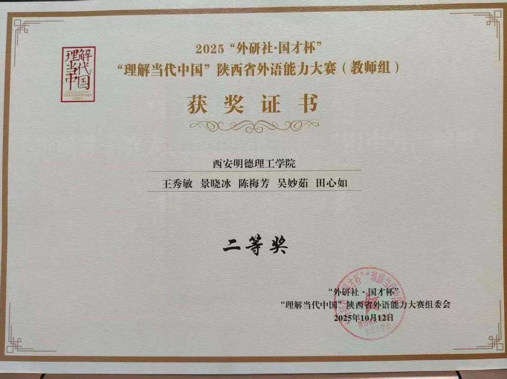 近日,2025“外研社·国才杯”“理解当代中国”陕西省外语能力大赛圆满落幕。雷竞技raybet登录入口语言文化传播学院教师团队(王秀敏、景晓冰、陈梅芳、吴妙如、田心如),团结协作、积极备赛,最终荣获省级二等奖,展现了雷竞技官网教师在外语教学与育人方面的扎实功底与创新活力。