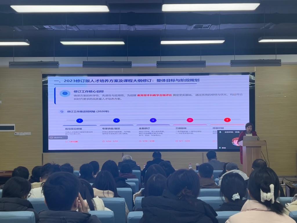 学院副院长柴芸就学期末教学工作安排进行部署。她首先传达了学校2025-2026学年第一学期第四次教学工作会议精神,并围绕人才培养方案与课程大纲修订、期末考试命题与阅卷、下学期排课、课堂教学质量、毕业论文质量管理、实习基地建设、实验室管理等八个方面进行了详细安排。她强调,全体教师要高度重视近期教学检查中存在的问题,严格落实整改要求,注重教学过程的规范性与创新性,在试卷设计、课堂管理、毕业论文指导等方面必须做到严谨细致、提质增效。