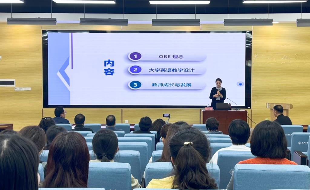 首先,张玲老师根据自己的授课经验,结合大学英语教学实践,现场进行了一小节示范,在示范课中就教学理念、课程设计、思政元素融入进行了讲解。示范课结束后,张老师做了题为“基于OBE理念的大学英语教学设计”的讲座。首先张老师提到OBE理念的概念即以结果为导向的教育,强调学生的学习成果和实际应用能力,这一教育理念的核心是关注学生的学习成果,而不仅仅是传授知识。其次,谈到基于OBE理念的大学英语教学设计,首要的任务是明确授课对象和学生学习英语的动机,学生的需求和目标是我们设计课程的出发点。在此基础上,要致力于根据教材创新设计教学内容,将思政元素融入到课程中,以提高学生的综合素质。最后,张老师结合自己的工作实践和认识,谈了教师的成长与发展,她认为高校教师的成长与发展需要在三个方面得以体现,即教学设计能力、教学实践能力和教学研究能力。教师应积极主动地寻求自主学习的机会,不断提升自己的教学水平。关键是要将教学创新贯穿于教学实践中,不断调整和改进教学方法,以适应不断变化的教育环境。