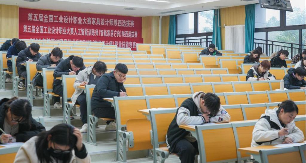 本届竞赛设置职工组与学生组单人赛,分理论考核与实操竞赛两部分:理论考试聚焦家具材料学、结构力学、行业规范等核心知识,采用闭卷答题形式;实操环节要求选手完成“家具原创设计—数字化建模—效果图呈现”全流程作业。比赛中,选手们亮点频出:有的将新中式榫卯结构融入现代家具设计,有的以环保再生材料打造绿色家居方案,充分展现陕西家具行业人才的创新思维与实操能力。