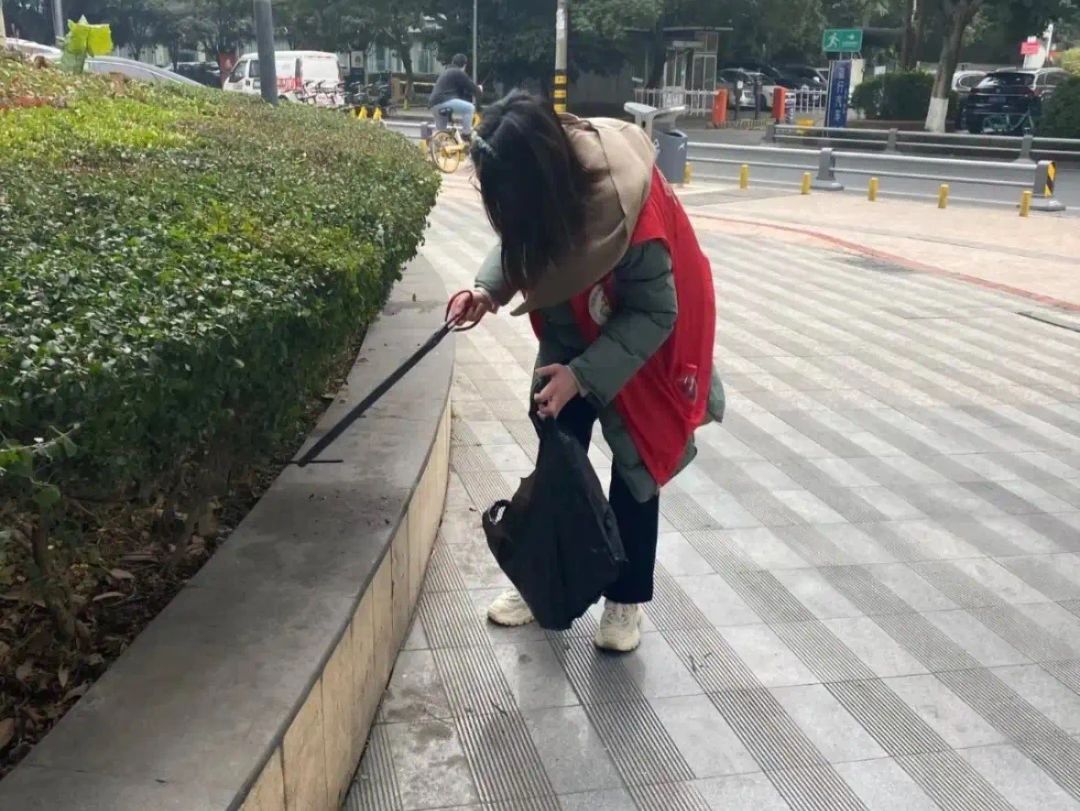 活动当天,我们身穿红马甲,手持垃圾袋和夹子,沿着社区道路、绿化带细致清理。烟头、纸屑等看似微小的垃圾,却隐藏在砖缝、草丛中,清理时需要弯腰多次确认。随着垃圾袋逐渐装满,原本整洁的路面焕然一新,这种成就感让我感受到“细微处见真章”的意义。