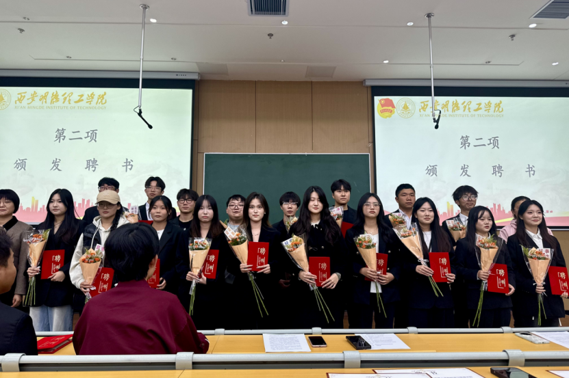 随后,大会依次推进各项议程。在颁发聘书环节,学院为第七届团学干部郑重授予聘书。这份聘书承载着学院对青年学子的信任,既是对他们过往表现的肯定,更是对其未来发展的期许,让每一位接过聘书的干部都深刻感受到身上的责任与光荣。
