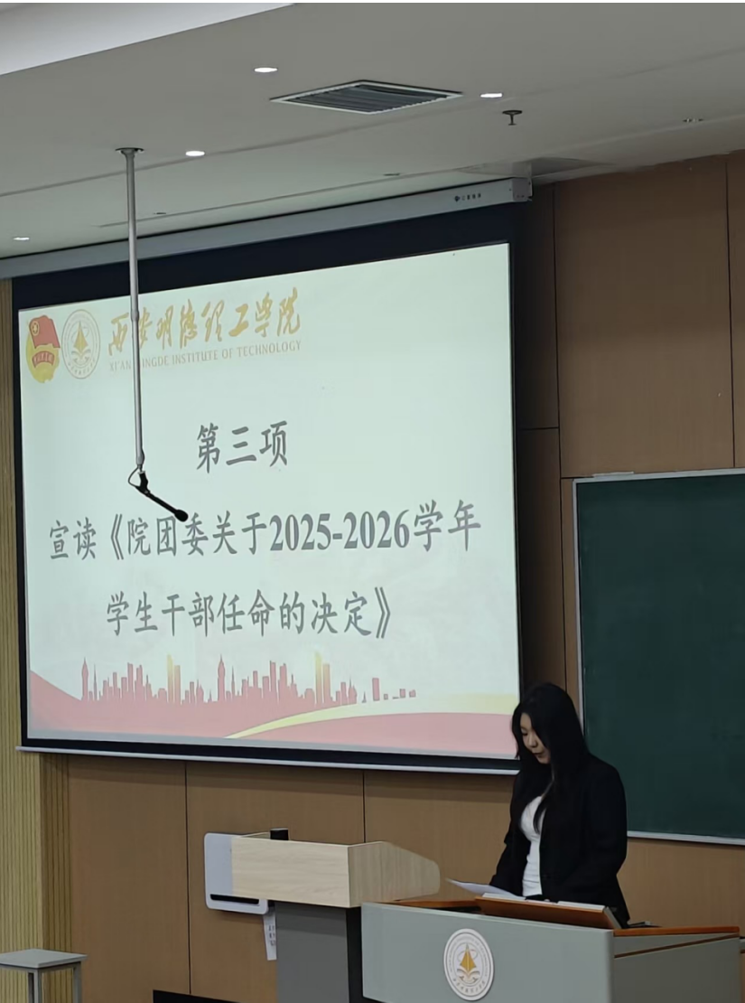 紧接着,大会宣读《院团委关于2025-2026学年学生干部任命的决定》,并公布了第八届团委和学生会干部团队成员名单。新一届团队涵盖团委、学生会及各职能部门,其中团委设学生副书记岗位,学生会设主席团,同时下设组织部、宣传部、实践部、学术部、文体部、办公室、新闻传媒部、权益服务部及志愿者服务队九大部门,各部门均明确负责人,形成了分工清晰、权责明确的工作架构,为后续高效开展团学工作提供了组织保障。