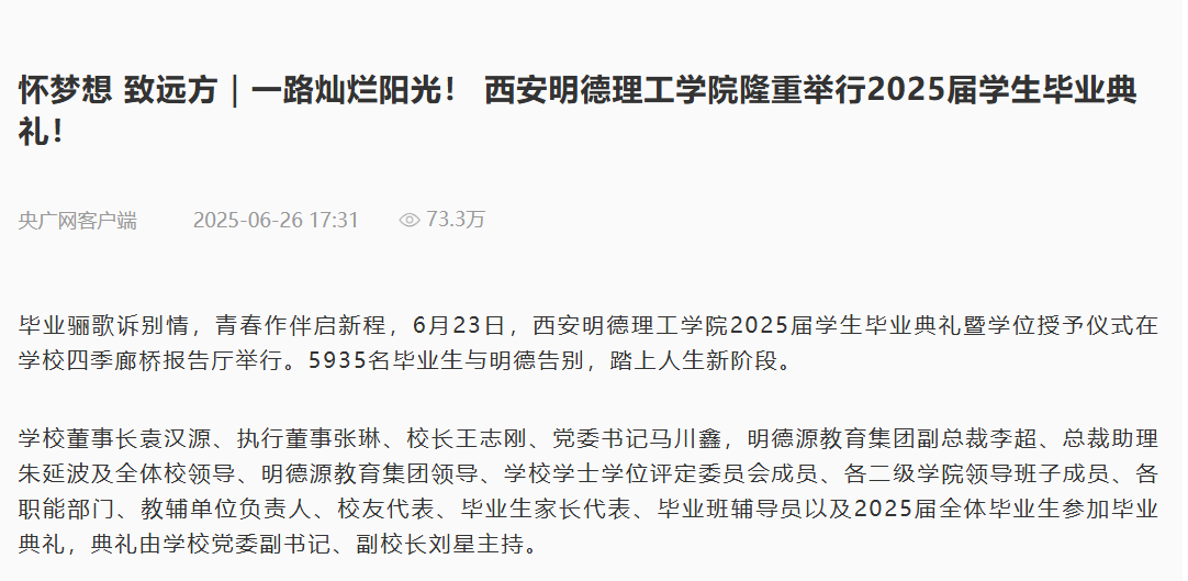 告别大学这个让人留恋的人生驿站,无限广阔而美好的前景正展现在你们面前,希望你们时刻铭记“明德亲民至善”的校训,“勤学、修德、明辨、笃实”的校风,“勤学善思、知行合一”的学风。在未来人生的新征程中一路披荆斩棘,采撷到成功的硕果,相信你们定会书写出属于自己无比灿烂的未来,愿此去繁花似锦,再见依旧如故,记得常回家看看,祝2025届全体毕业生毕业快乐!
