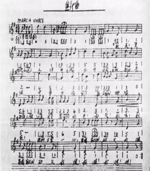 1935年《风云儿女》电影片头齐唱《义勇军进行曲》片段:我们万众一心,冒着敌人的炮火,前进!冒着敌人的炮火,前进!前进!前进!进!