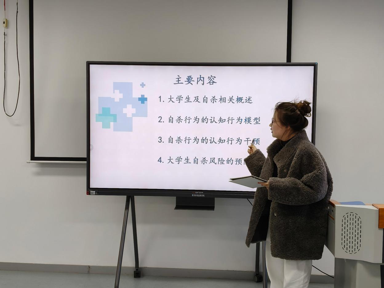 会上,专职心理咨询师强诺涵以《大学生高自杀风险的认知行为干预》为题开展专题培训。她结合丰富的咨询案例,从大学生高自杀风险的识别指标、自杀认知行为模型及危机干预技巧等方面进行了系统讲解。培训内容兼具理论深度与实践指导性,为咨询师们精准应对此类危机事件提供了科学的方法支撑和清晰的操作路径,有效提升了团队处理复杂心理危机的专业能力。
