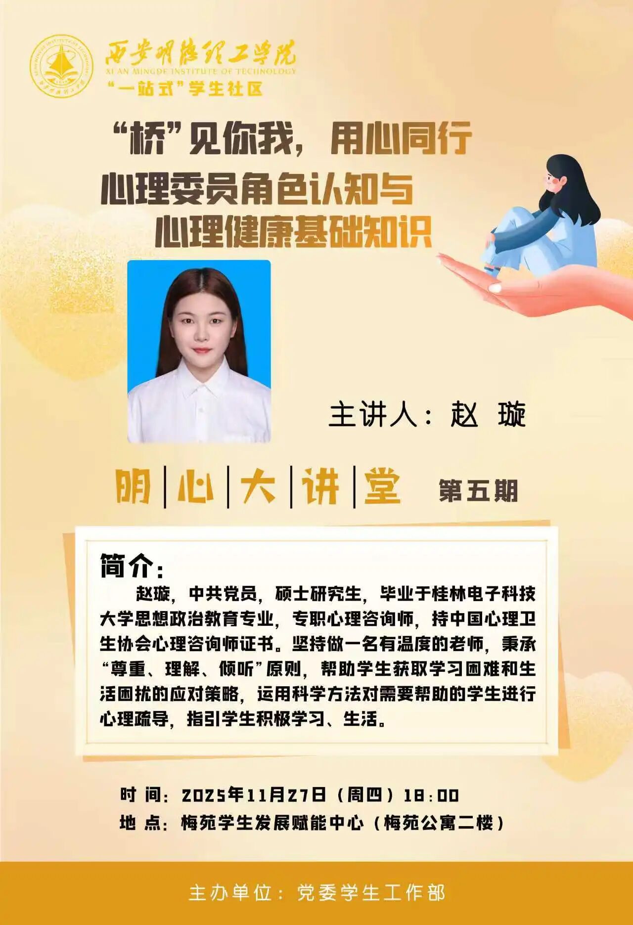 一、培训时间2025年11月27日 18:00二、培训地点雷竞技raybet登录入口长安校区梅苑学生发展赋能中心(梅苑公寓二楼)三、报告会专家党委学生工作部 赵璇四、培训对象 智能制造与控制技术学院、国际教育学院班级与宿舍心理委员明天我们不见不散~