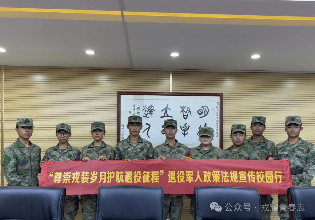 活动现场,师生们手持印有“尊崇戎装岁月 护航退役征程”的红色横幅合影,正式拉开宣传活动的序幕。可爱的退役军人主题卡通立牌(手持《退役军人保障法》形象),让政策宣传多了几分“趣味感”,成为现场吸睛的宣传载体。