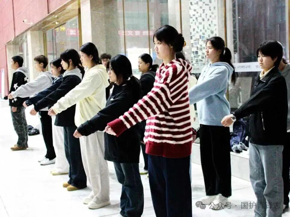 当最后一节晚自习的铃声消散,白日的喧嚣渐次退场,当教学楼的灯光逐间熄灭,中心广场的一隅亮起微光,迎来最“热闹”的时刻。一道道身影与月光下移动,脚步声、口令声在夜色中的铿锵回响,织成独属于国护的旋律—— 一场与疲惫对抗、与细节较真的修行。