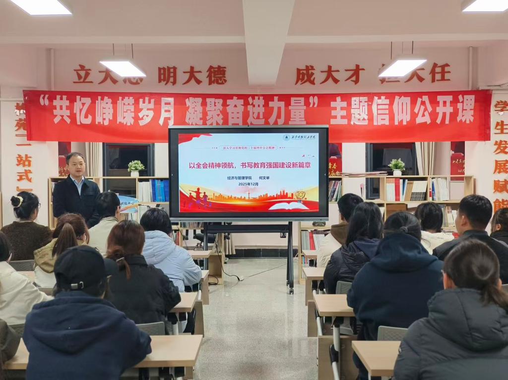 12月4日晚,经济与管理学院学生第一党支部在“一站式”学生社区梅苑学生发展赋能中心举办“共忆峥嵘岁月凝聚奋进力量”主题信仰公开课第三讲,特邀经济与管理学院党委书记何文举担任主讲嘉宾。学院各支部学生党员、发展对象及入党积极分子代表参加了学习。