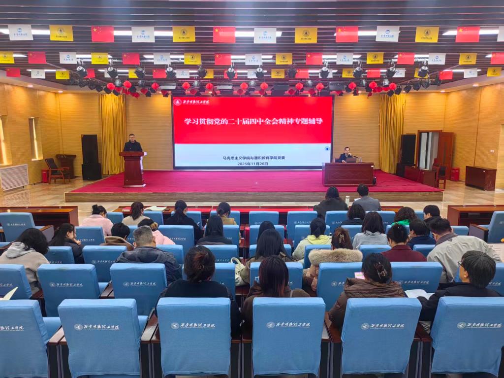 为深入学习贯彻党的二十届四中全会精神,精准把握全会核心要义、战略部署与实践要求,切实将理论学习成果转化为推动学院内涵式高质量发展的内生动力,2025年11月26日下午,马克思主义学院与通识教育学院党委在建德楼203报告厅举办学习贯彻党的二十届四中全会精神辅导报告会。本次报告由学院党委书记王君涛主持,学院领导班子和全体教职工共同参加学习。