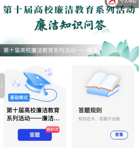 选择廉洁知识问答,仔细阅读答题规则,点击答题填写个人信息并开始答题,本次答题包含20道题,总分100分。