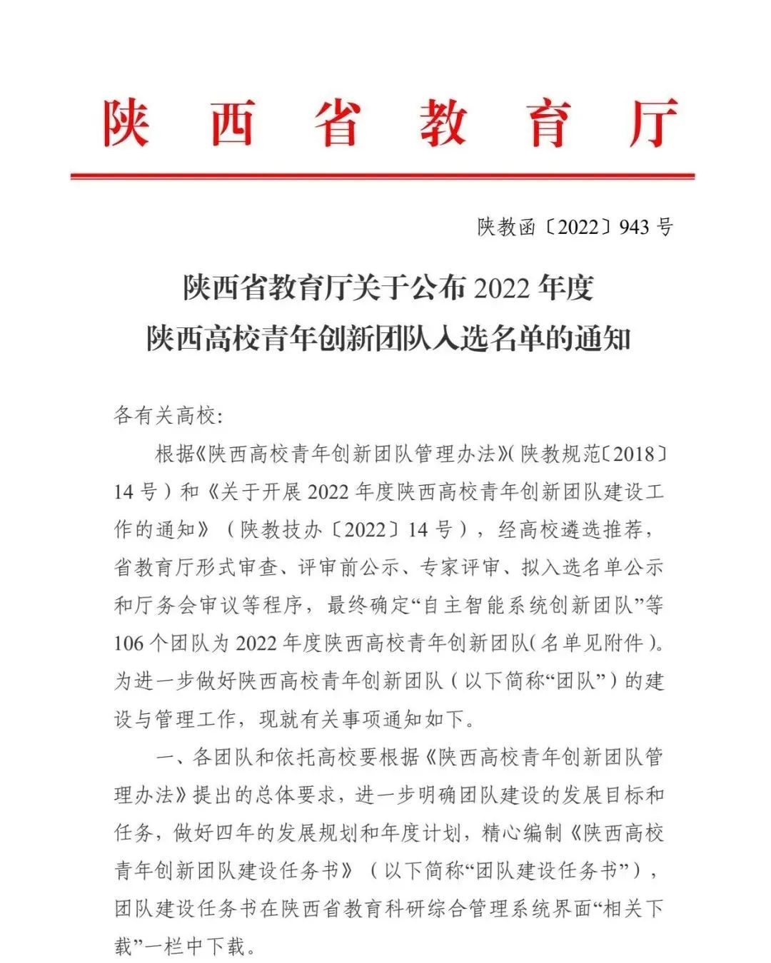 近日,陕西省教育厅印发《陕西省教育厅关于公布2022年度陕西高校青年创新团队入选名单的通知》,全省共计106个团队入选。其中,雷竞技官网赵盼博士领衔申报的“航空复材构件先进制造技术创新团队”成功入选。
