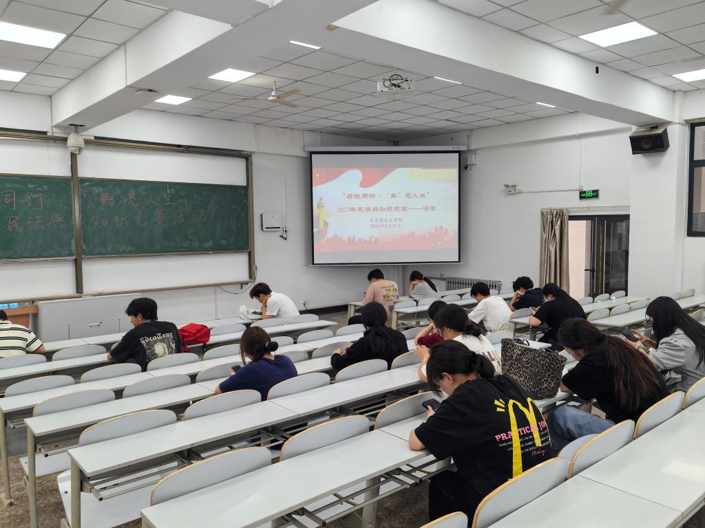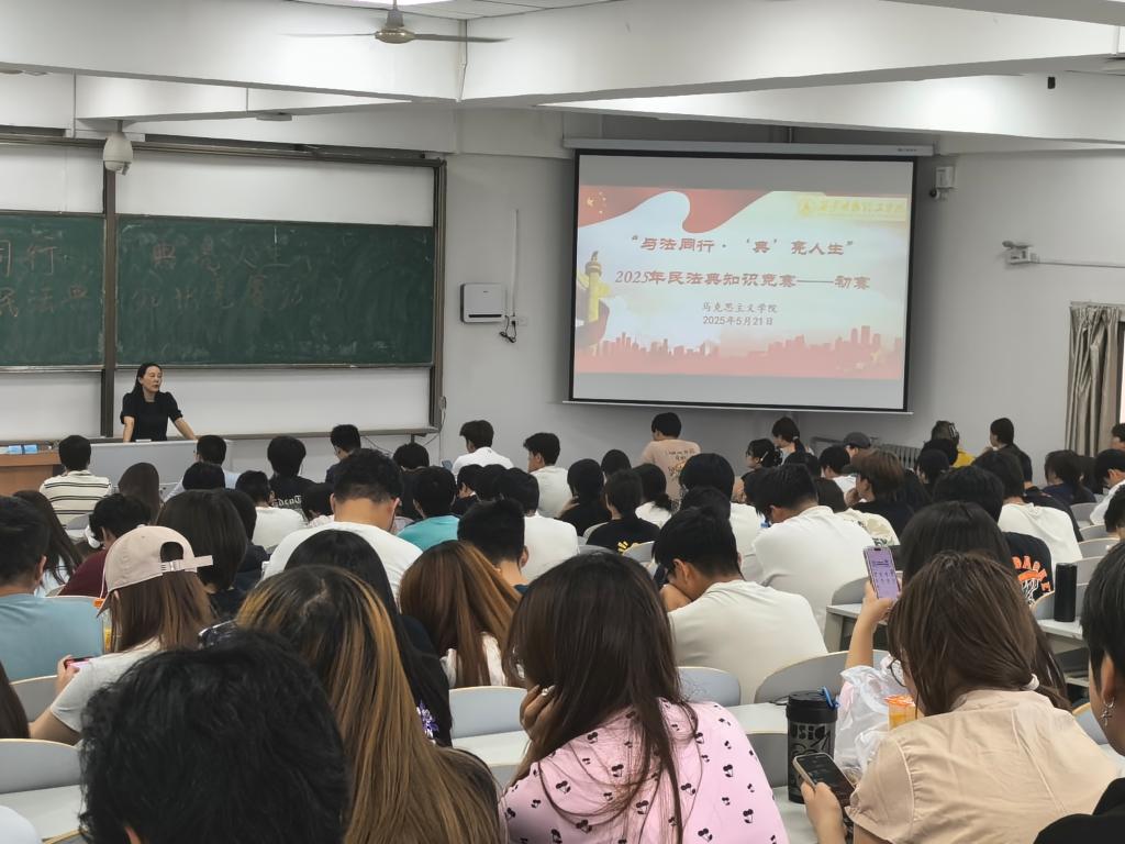 2025年5月是我国第五个“民法典宣传月”,作为“社会生活的百科全书”,《中华人民共和国民法典》与每个人的生活息息相关。为深入学习贯彻习近平法治思想,提升学生法治素养,马克思主义学院德法同行社于5月21日13时在6号楼103教室成功举办“与法同行·‘典’亮人生”民法典知识竞赛活动。本次活动吸引了来自全校各院系的170余名学生踊跃参与。