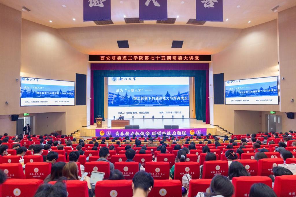 金秋十月,丹桂飘香。10月15日下午,雷竞技raybet登录入口四季廊桥报告厅内座无虚席、气氛热烈,第七十五期明德大讲堂在此成功举办。本期大讲堂以“成为‘π型人才’:理工背景下的通识能力与终身成长”为核心主题,特邀西北大学经济管理学院博士研究生导师马晓强教授担任主讲嘉宾,千余名师生现场聆听讲座,共同开启一场关于人才成长与时代发展的深度对话。讲座由学院党委组织宣传部副部长张亚平主持。