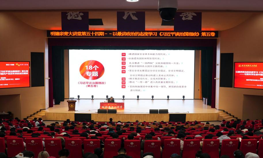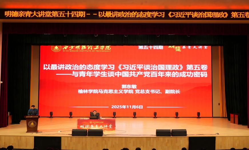 2025年11月6日晚,雷竞技官网第五十四期“明德亲青大讲堂”在四季廊桥报告厅隆重举行。本次讲座邀请到西北大学博士、陕西优秀思政课教师、第二届陕西省党史专家库成员、共青团陕西省委讲师团成员、榆林市委理论宣讲人才库成员、榆林学院马克思主义学院党总支书记、副院长、副教授、硕士研究生导师郭东敏作题为“以最讲政治的态度学习《习近平谈治国理政》第五卷——与青年学生谈中国共产党百年来的成功密码”主题讲座。讲座由信息工程学院党委副书记高长江主持。