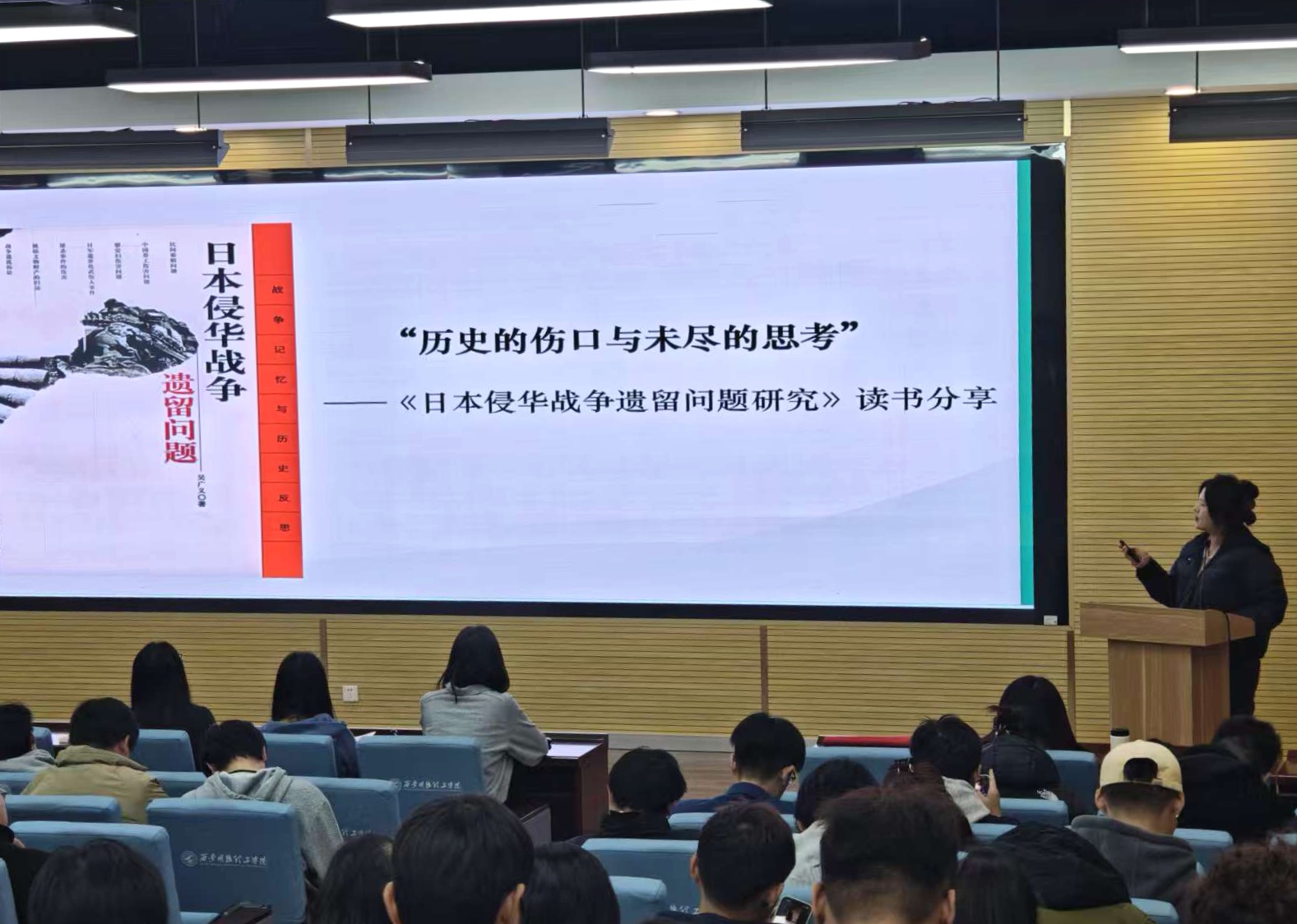 张剑蓉老师围绕《日本侵华战争遗留问题研究》一书展开分享。她以“是什么—为什么—怎么办”的脉络进行文本梳理。首先,她通过未完成的正义、被篡改的记忆与日遗化武带来的沉默威胁三部分揭开战争遗留问题;其次,深挖问题存续的根源,从美国对日扶持的历史伏笔到日本国内政治力量对历史的歪曲,再到跨国诉讼面临的法律困境;最后张老师指出作为当代青年必须以扎实史料守护历史记忆,用自身成长与社会建设的实际行动直面历史、奔赴未来。