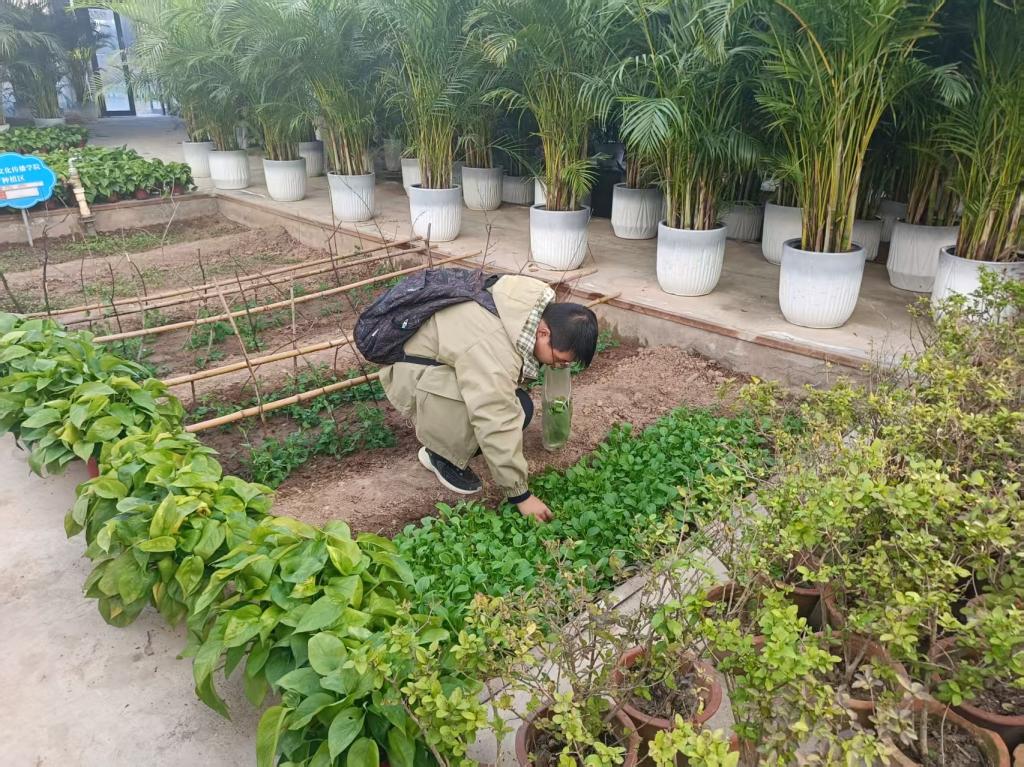 抵达基地后,养护工作同步在田间作物与盆栽绿植两类区域展开,老师指导学生们按照蔬菜品类仔细巡查蔬菜长势,清理杂草,并根据需求进行补水,各个环节有条不紊;同时老师也领着学生们聚焦基地内的盆栽绿植,开展浇水、状态巡查等日常照料,细致保障盆栽的生长条件。目前,基地内前期播种的蔬菜整体长势良好,其中菠菜和青菜已达到采摘标准,为此次实践活动奠定了收获的基础。