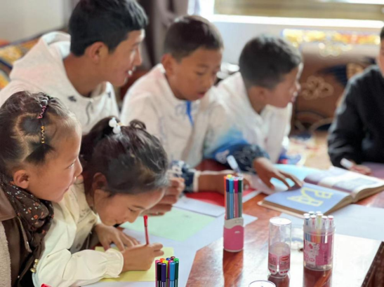 绘画课堂上孩子们以“我心中的中国”为主题,用画笔描绘出对祖国的热爱和美好愿景,一幅幅色彩斑斓的画作展现了他们对祖国清澈的爱,厚植藏区儿童的爱国主义情怀,进一步铸牢中华民族共同体意识。