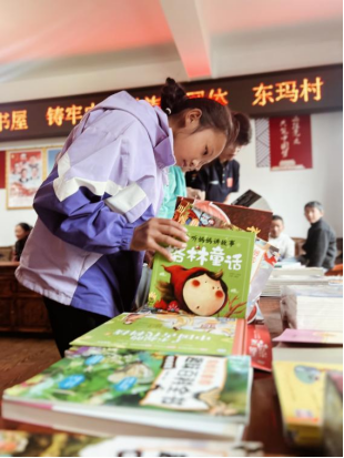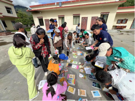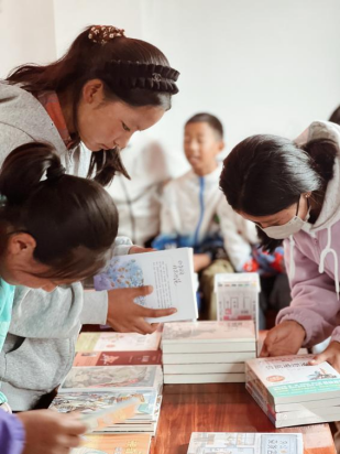 在东玛村村委会的篮球场上,志愿者将爱心企业西安老城根Gpark和爱心人士捐赠的100余册书籍摆放在阳光下,开展阅读活动,并为孩子们孩子们发放作业本、水彩笔等学习用品。