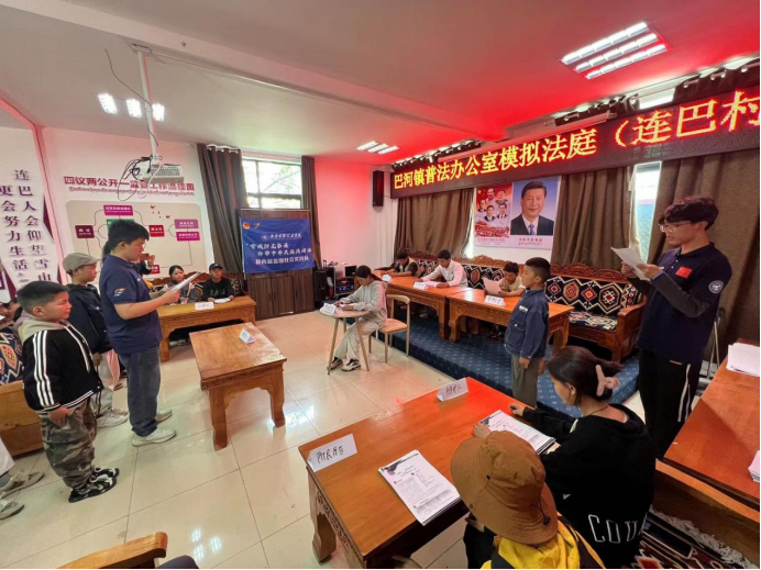 与此同时,在巴河镇政府及巴河普法办公室的大力支持之下,在连巴村村委会的会议室中,为藏区孩子们带来了别开生面的模拟法庭活动。小小法官,小小检察官,小小律师,通过身临其境的角色扮演,模拟体验法庭庭审全过程,学习法律知识,了解法律对未成年人的特殊保护,体会法律的尊严,感受法治建设在推动中国式现代化进程中所发挥的重要作用。工布江达县县检察院检察官也参与到了本次模拟法庭活动之中,并鼓励孩子们尊法、学法、守法、用法,做新时代好少年。