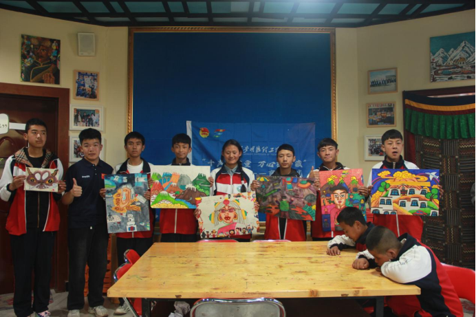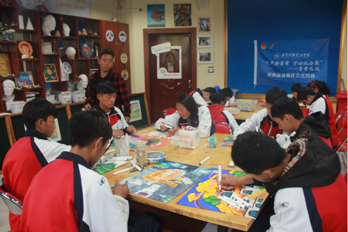 在绘画教室里,聋哑教师宁晓寒老师正在给孩子们教授着藏式水彩画,每一份作品都具有浓郁的民族特色且形象生动,志愿者闫海瑞同学作为绘画艺术生认真观摩后表示:我是以水彩为主要,看到他们的作品觉得视觉冲击很大,和内地的作品风格明显不同,热烈浓重充满热情,孩子们的想象力和功底都非常的好,我要向孩子们多多学习。随后,他也拿出自己和雷竞技官网艺术学院教师、青年画家范争争的作品和师生交流,宁老师不仅给孩子们讲解着老师的画法,更是耐心地讲述着老师的个人简历和获奖经历,鼓励孩子们多向老师学习,不断突破自己,沿着专业路线好好发展,获得人生更大成就。孩子们不断地竖起大拇指,也表示着自己的决心与信心。在课堂结束后,宁老师带领志愿者们走进一个爱心基金捐建的教师,让大家看到了很多等待拍卖的作品,超高的技术让志愿者们感慨聋哑孩子们艺术天赋,也看到了他们美好的就业前景,感谢爱心人士们对残障孩子的帮助。