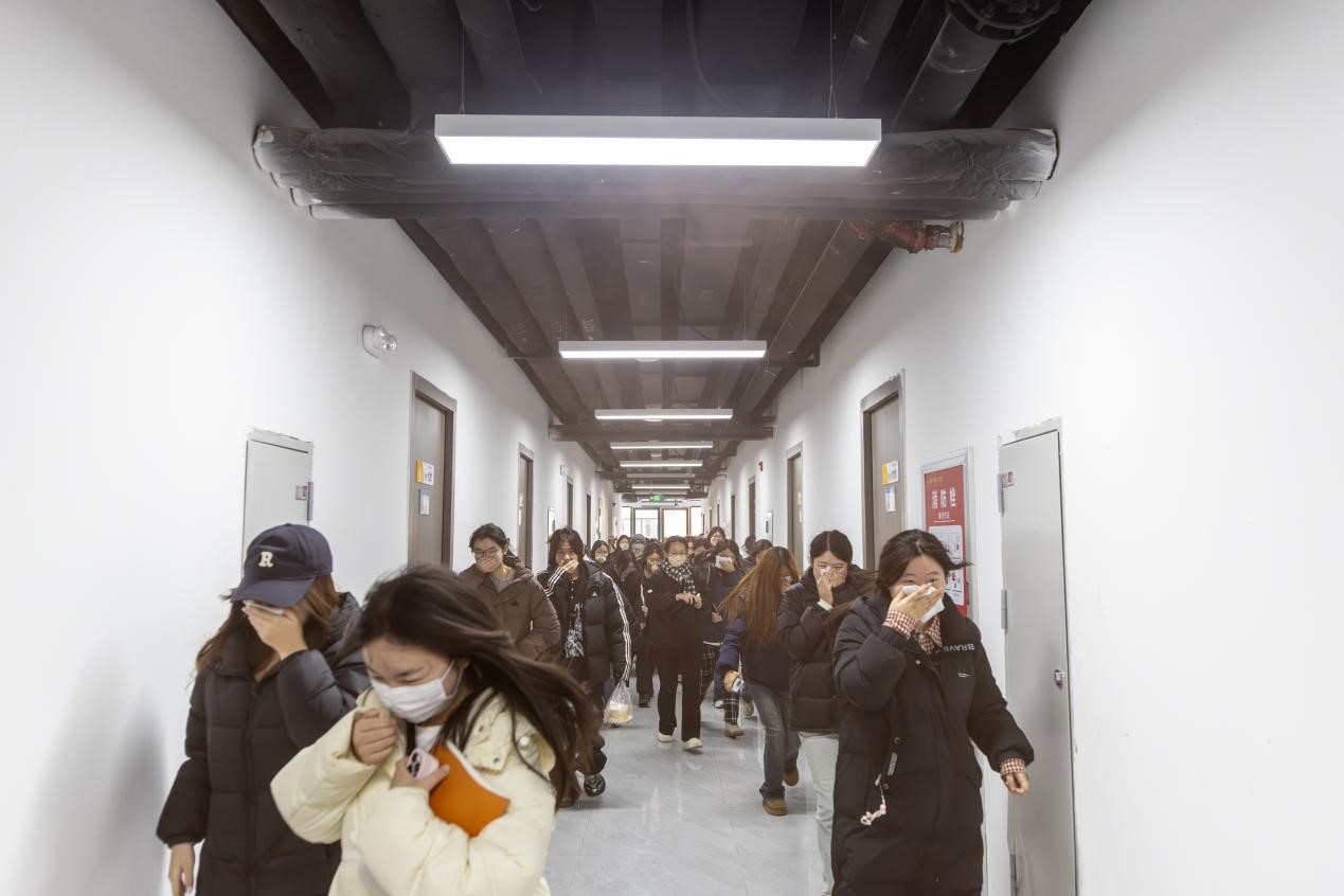 在公寓管理员、辅导员及学生志愿消防员的引导下,楼内近2000名学生在短时间内用湿毛巾捂住口鼻,沿楼梯间弯腰低姿,按照预定的疏散路线快速、有序地向楼外指定安全集合点撤离。整个过程紧张而不慌乱,疏散通道畅通,关键位置均有工作人员指引提醒,防止发生拥挤、踩踏。