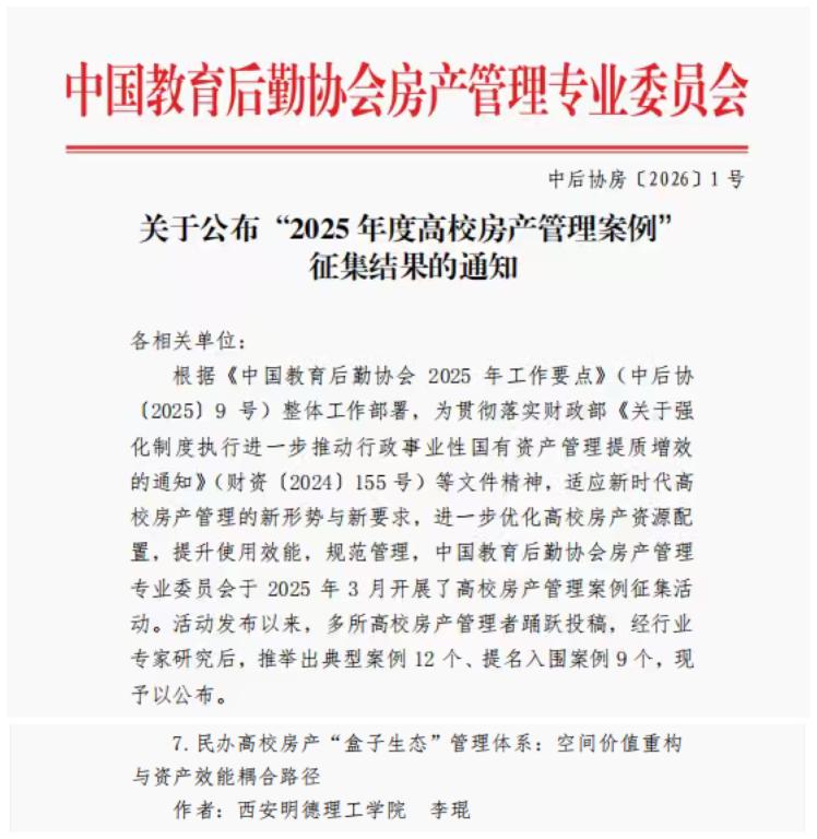 近日,中国教育后勤协会房产管理专业委员会公布2025年度高校房产管理案例评选结果,雷竞技官网资产管理处申报的《民办高校房产“盒子生态”管理体系:空间价值重构与资产效能耦合路径》成功入选。这标志着雷竞技官网在房产资源优化与资产管理机制创新方面取得重要进展。