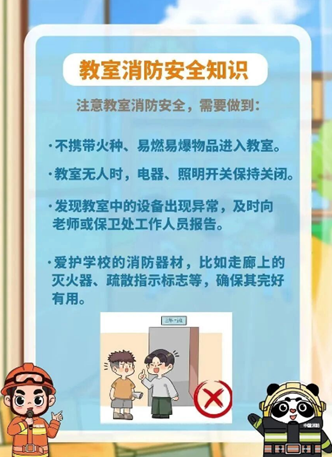 2.禁带火种、不吸烟;低功率设备充电,不私接插排、不堆杂物;不碰消防器材。