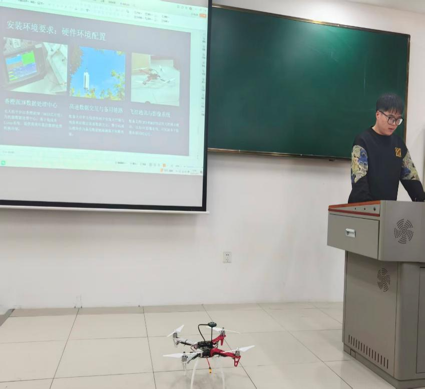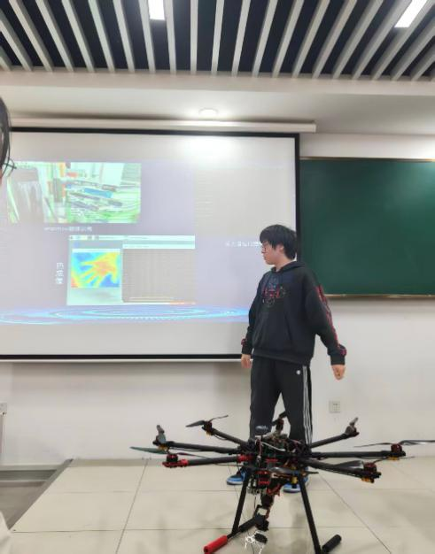 比赛现场,各团队精彩呈现了多样化的作品。从基于履带式结构的“采履双控”现代农业采摘机械,到融合ESP32主控的火灾应急小车;从实现多光谱数据采集的无人机系统,到基于TensorFlow的热成像物体识别方案,作品覆盖硬件设计、算法优化、系统集成等多个维度。在展示过程中,选手们结合PPT详细阐述作品的设计理念、技术路线及应用场景,同时通过实物演示让答辩老师更直观地了解作品功能,如“采履双控”团队展示了作品在复杂地形下的稳定性和采摘效率,无人机组则现场操作六旋翼飞行器,结合投影屏幕实时呈现多光谱数据处理流程,引发现场观众的热烈讨论。